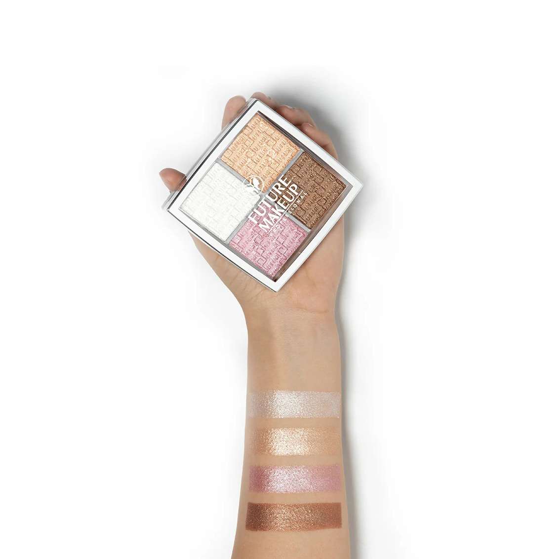 رنگهای هایلایتر شامل سفید یخی با شاین نقرهای برای استخوان گونه و چانه، صورتی باربی با شاین صورتی برای ترکیب با رژگونه و گوشه چشم، بژ طلایی برای آرایش برنز و کانتور، و مسی طلایی برای هایلایت بدن و جلوهای گرم و لوکس هستند.